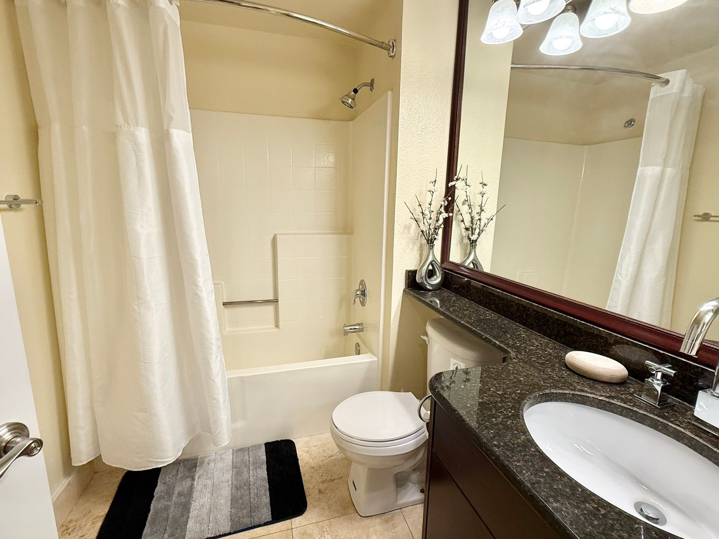 The open layout features granite countertops, stainless steel appliances, stylish furnishings, and a private balcony overlooking the main resort pool area—a great spot to enjoy your morning coffee or unwind after a long day. The spacious bedroom includes generous closet space and direct access to the bathroom for added privacy and flow.