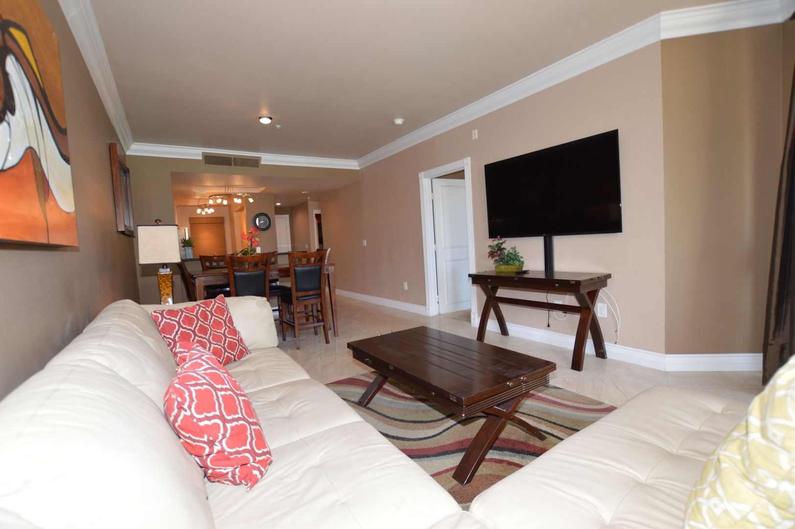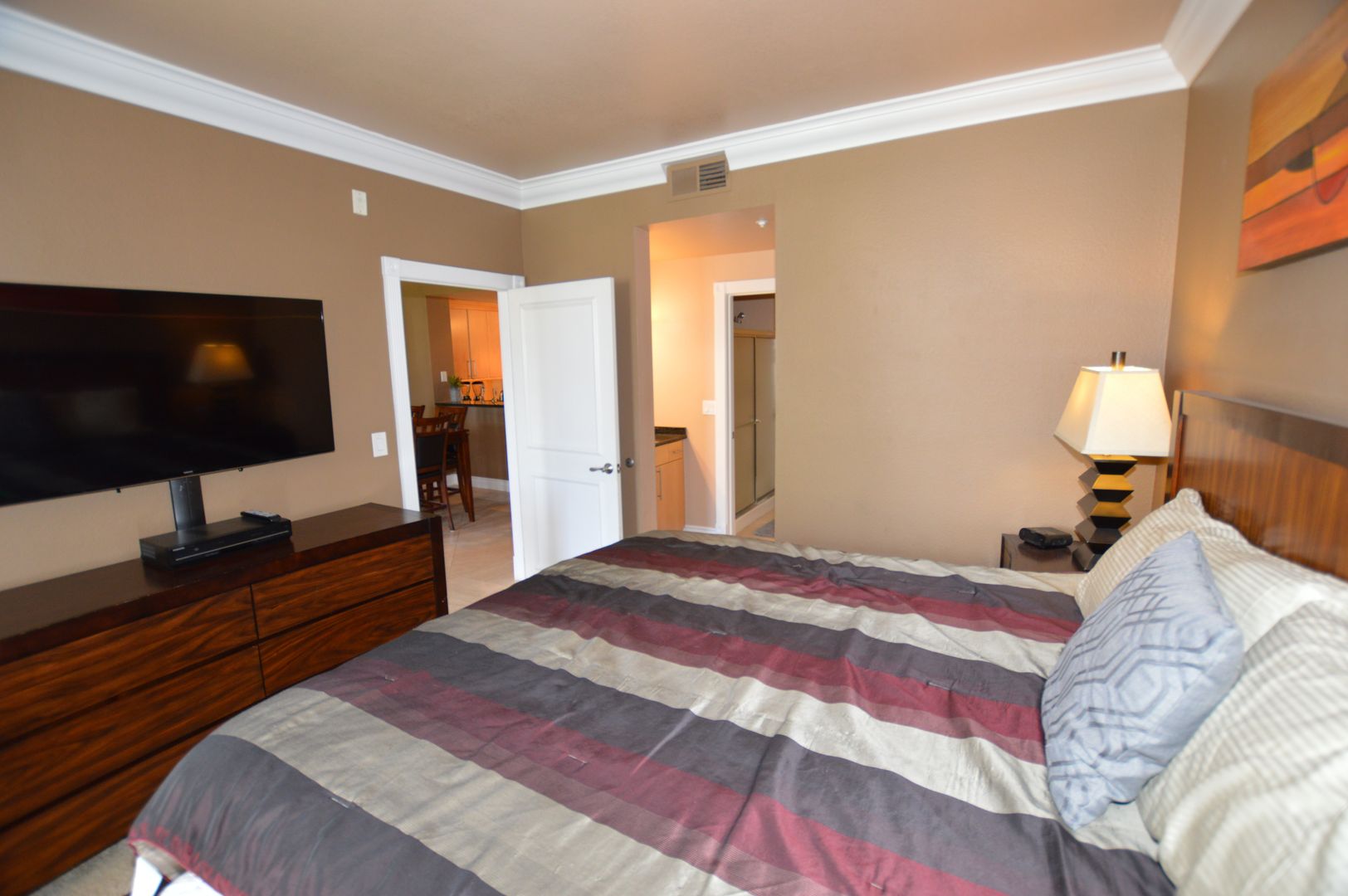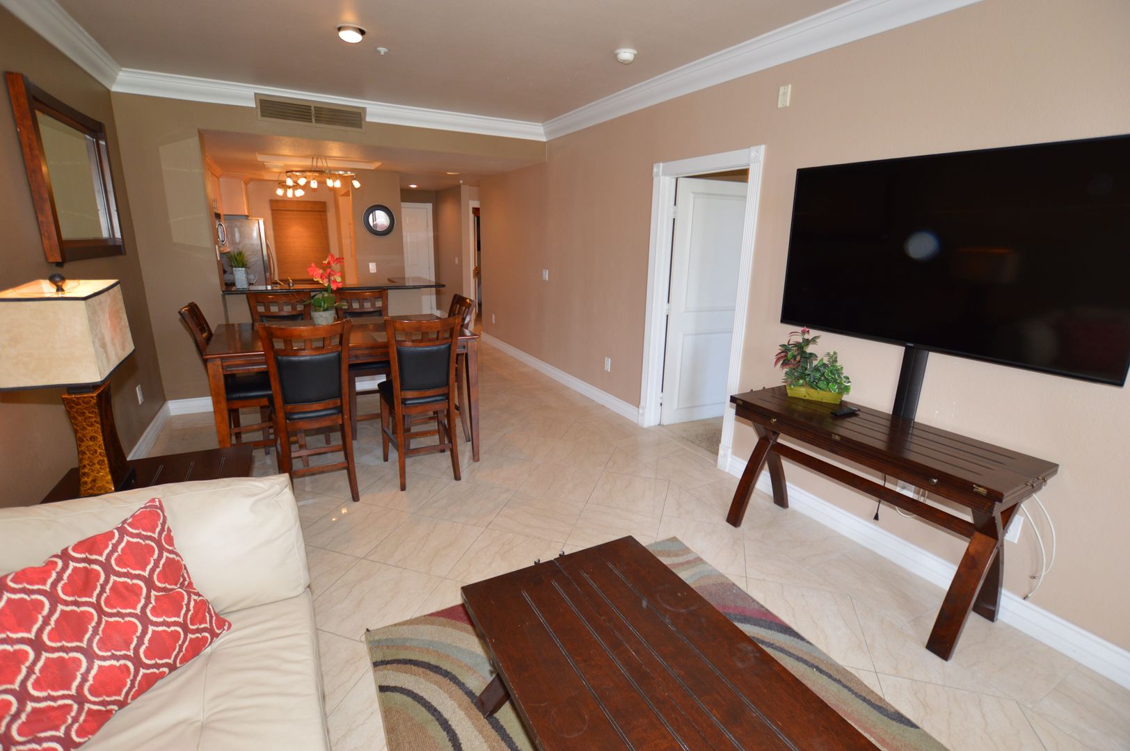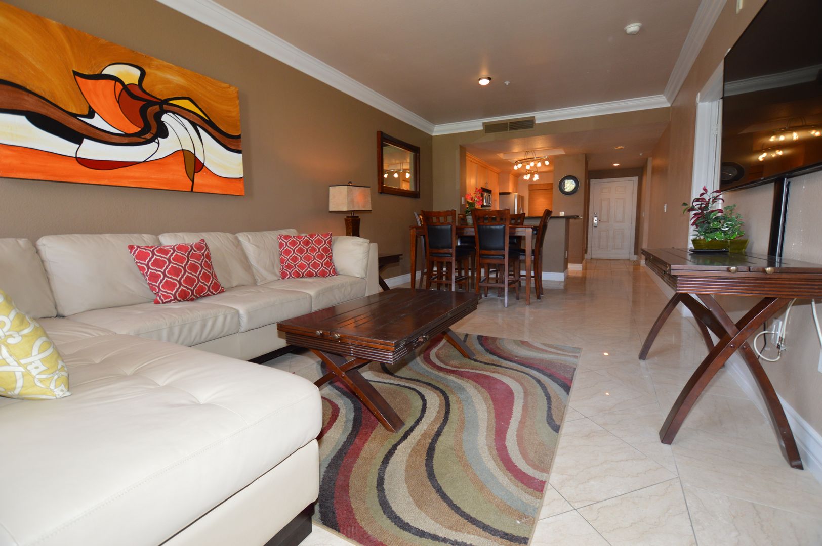Fully Furnished 2 Bd / 2 Ba Condo just 1 1/2 block to the heart of the Las Vegas Strip located in a 16 Acre Lushly Landscaped Community. Unit is Equipped with granite counter tops, stainless steel Refrigerator, Range, Microwave and Dishwasher appliances.